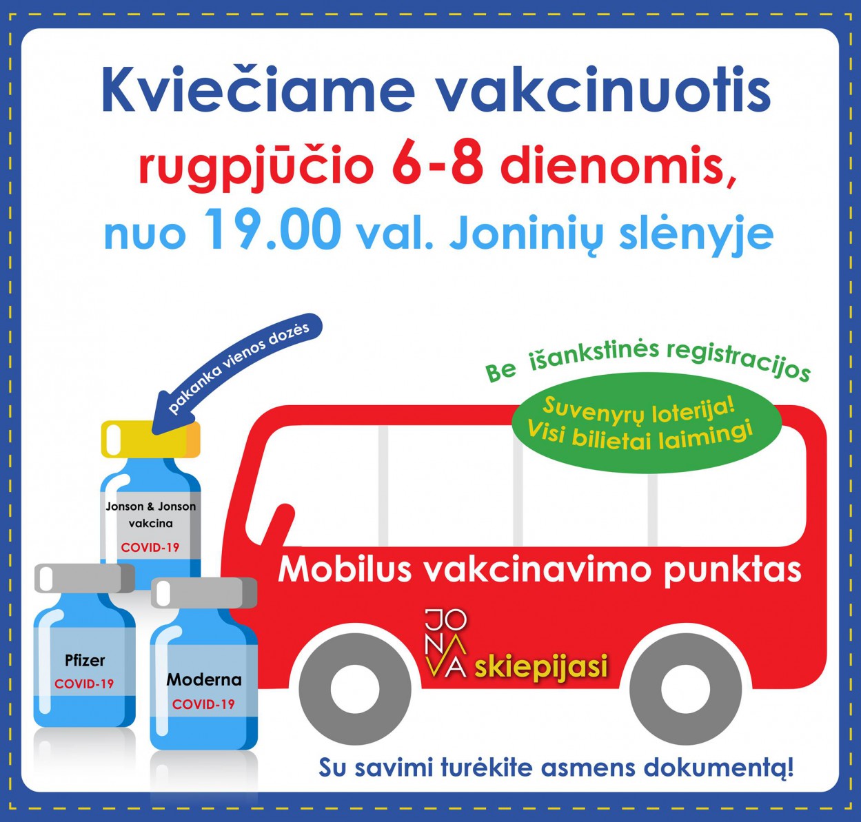 Jonavos miesto šventės metu, rugpjūčio 6-ąją ir 8-ąją, Joninių slėnyje lankysis mobilus vakcinavimo punktas. Šis veiks nuo 19 iki 21 val.