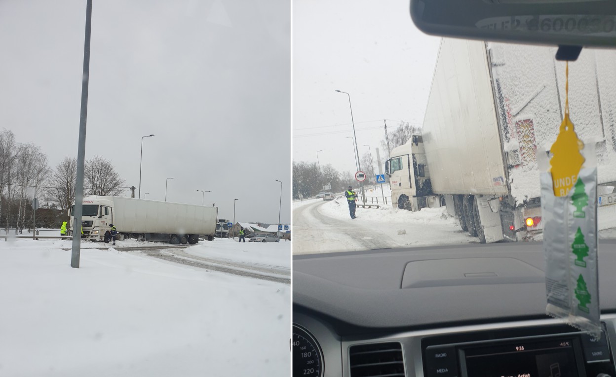 Šiandien, vasario 9-ąją, Plento gatvėje, ties žiedine sankryža, dėl slidžios kelio dangos vairuotojas (blaivus) nesuvaldė sunkiasvorės transporto priemonės bei nuslydo į kelkraštį. Būkite atidūs, kelyje formuojasi spūstys, eismą reguliuoja policijos pareigūnai.
