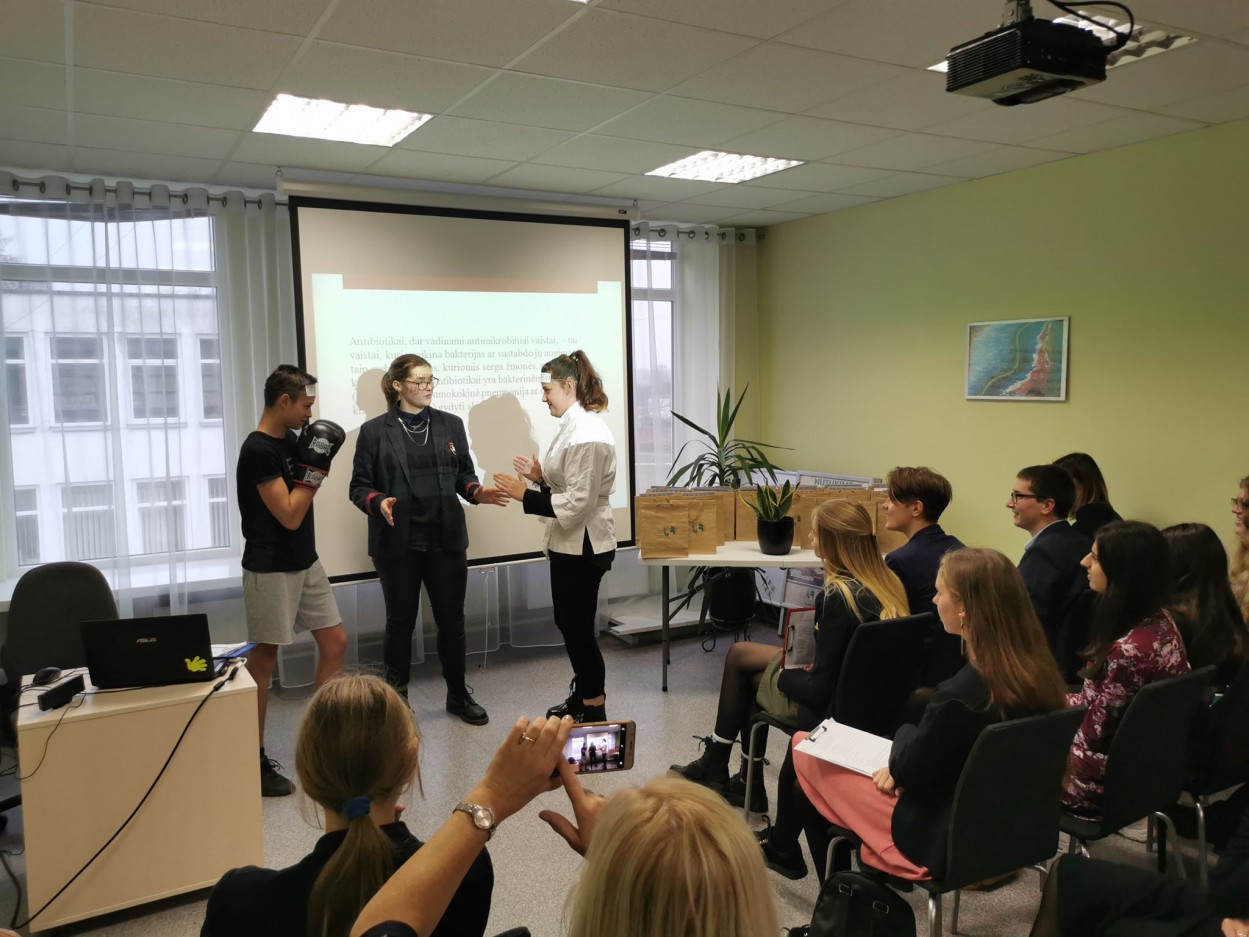 1 vietą 5-8 kl. amžiaus grupėje laimėjo Džiugas Stumbrys ir Paulina Bartasevičiūtė su pranešimu „Tinkama rankų higiena užkerta kelią mikroorganizmų plitimui“, 1 vietą 9-11 kl. amžiaus grupės laimėtoja – Kamilė Valvonytė su pranešimu „Žemė serga. Ar mes turime vaistu?“. Šios komandos patenka į konferencijos „Mokinys – mokiniui“ II etapą, kuris vyks š. m. lapkričio 28 d. Kauno r. Domeikavos gimnazijoje. Trečia komanda laimėjusi 1 vietą – Gabrielė Kotryna Kadžiulytė, Justė Zabarauskaitė ir Dominykas Zinkus su pranešimu „Atsparios antibiotikams bakterijos – pavojus žmonijai!“. Jie keliaus į konkurso „Drauge nugalėsime bakterijų atsparumą antibiotikams!“ II etapą, kuris vyks š. m. lapkričio 27 d. Lietuvos sveikatos mokslų universitete.