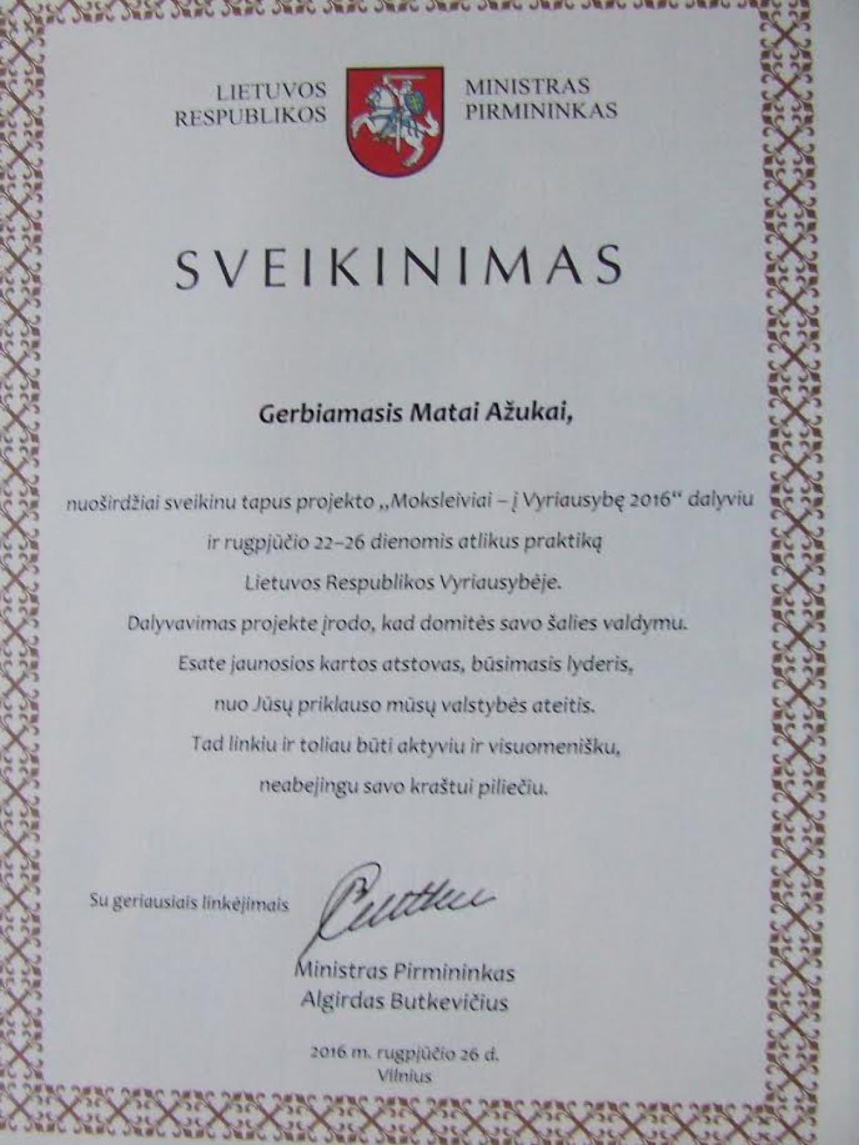 Pasak jonaviečio, jis niekada negalvojo, kad dar būdamas moksleiviu vaikštinės vienos įtakingiausių institucijų Lietuvoje koridoriais ir galės bendrauti su aukštas pareigas užimančiais žmonėmis.