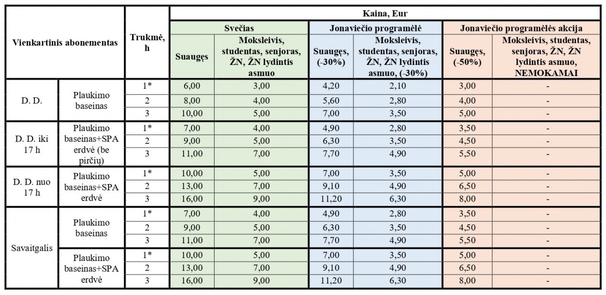 Brangiau už apsilankymą baseine ir SPA erdvėse reikės mokėti po 17 val. ir savaitgaliais. Didžiausia kaina, nustatyta suaugusiam Jonavos rajono gyventojui siekia 11,20 Eur – tiek kainuos 3 val. apsilankymas plaukimo baseine ir SPA erdvėse vakarais ir savaitgaliais. Rajono svečiui tokia pati pramoga kainuos 16,00 Eur.