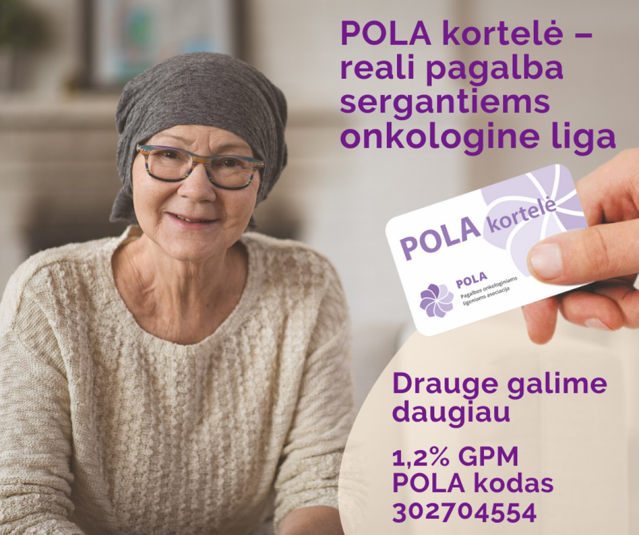 Siekiant suteikti realią pagalbą – jau 10 metų veikianti Pagalbos onkologiniams ligoniams asociacija (POLA) onkologiniams pacientams išduoda POLA kortelę. Kaip pažymi POLA direktorė Neringa Čiakienė, tai kortelė, padedanti išgyventi tiek finansiškai, tiek emociškai. „Kai išgirsti kiekvieną eurą skaičiuojančio asmens balse palengvėjimą, kad nuo šiol kasdieninė kelionė į radioterapiją vietoj 30,4 Eur kainuos 6 Eur, ar nuostabą keičiantį džiaugsmą, kad nemokamas bilietas į koncertą skiriamas ne tik jam, bet ir lydinčiam asmeniui, supranti, kad POLA veikla negali liautis, nori dar labiau sutelkti pastangas, kad POLA kortelė atsidurtų kiekvieno onkologinio paciento kišenėje, itin vertini kiekvieno asmens indėlį, rėmėjų paramą“.