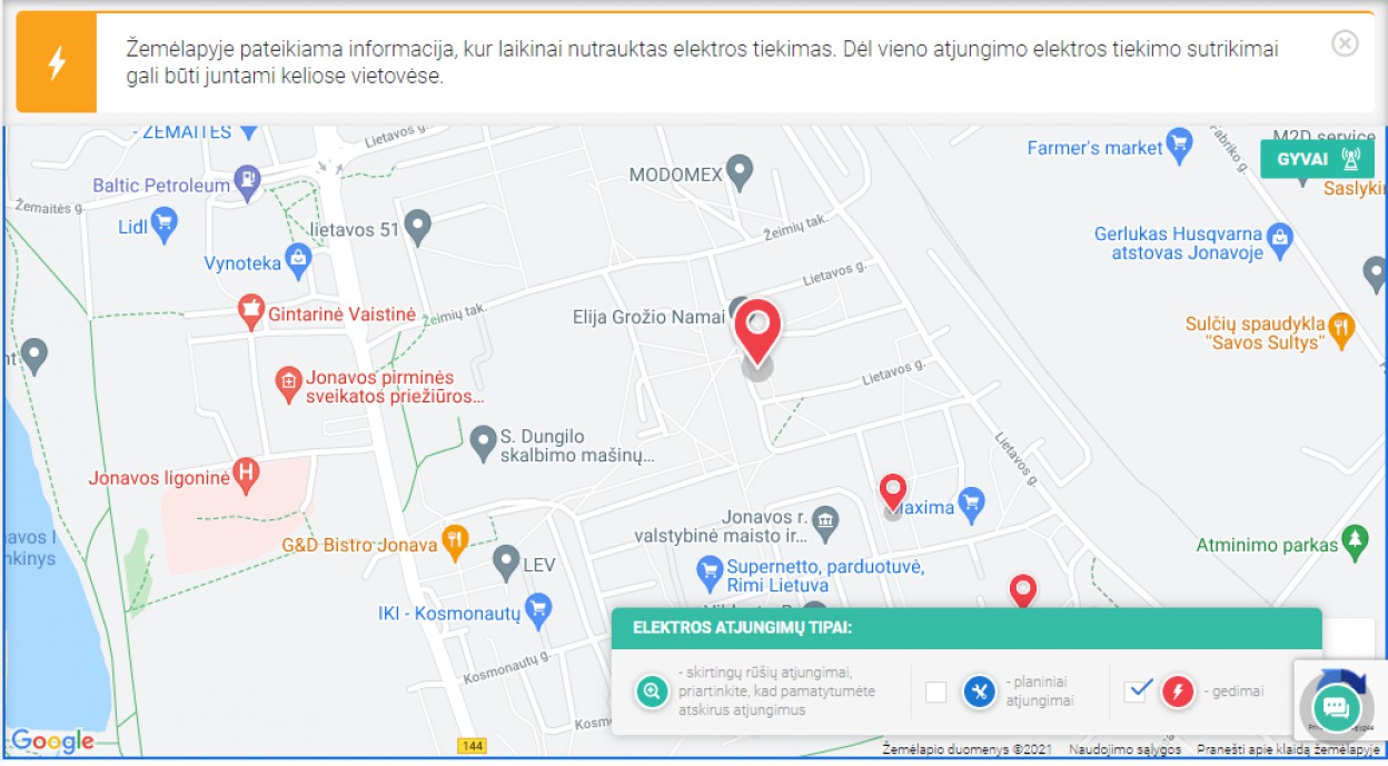 Jei informacijos apie gedimus negavote ir žemėlapyje jos nėra, registruokite sutrikimą internetu arba nemokamu ir visą parą veikiančiu telefonu 1852.