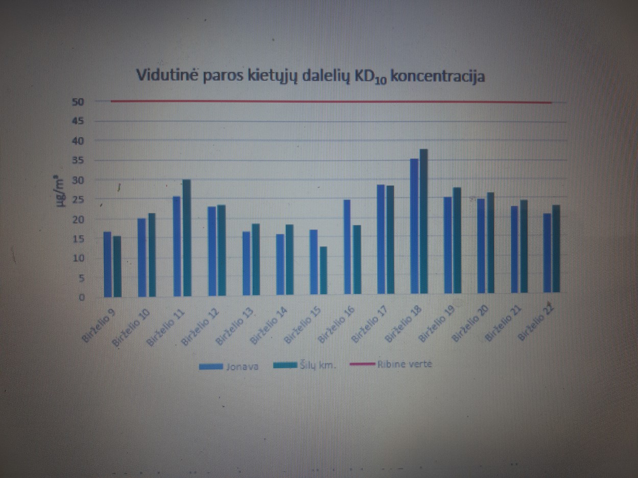 Viso tyrimų laikotarpiu vyravo šiaurinių ir rytinių krypčių vėjas, orai buvo permainingi ir dažniausiai palankūs teršalams sklaidytis. Vidutinė paros kietųjų dalelių KD10 koncentracija atskiromis dienomis svyravo nuo 12,6 iki 37,7 µg/m³, t. y. sudarė 25–75 % ribinės vertės (50 µg/m³). KD10 paros ribinės vertės viršijimo atvejų nenustatyta.