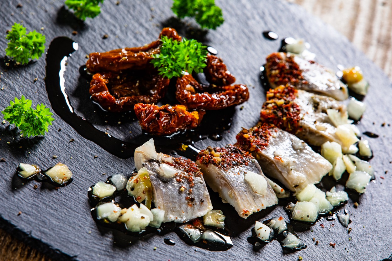 Kviečiame praplėsti naminį silkių patiekalų meniu ir šventinio stalo vaišes papildyti silke su saulėje džiovintais pomidorais.