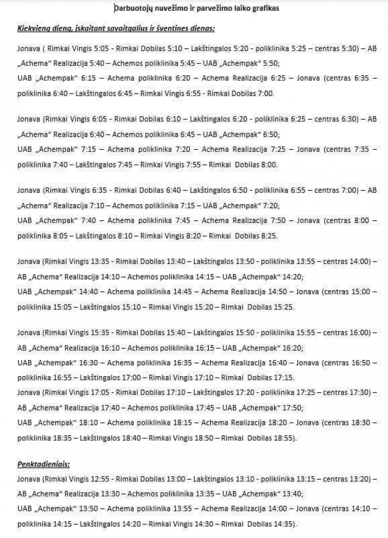 „Nuo šių metų rugsėjo 1 d. miesto autobusų parkui atsisakius maršruto Jonava-AB Achema, priimtas sprendimas koncerno „Achemos grupė“ Jonavos regiono įmonių darbuotojus vežti į/iš darbo užsakomuoju reisu.