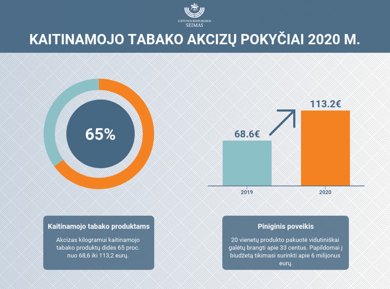 Pagal priimtas pataisas kaitinamojo tabako produktams akcizų tarifą nutarta didinti nuo 68,6 iki 113,2 euro, t. y. 65 proc. (vietoj numatyto 78,5 euro, arba 14,4 proc.) už kilogramą produkto. Padidinus akcizų tarifą kaitinamojo tabako produktams dėl mokestinių veiksnių 20 vienetų kaitinamojo tabako produktų galėtų pabrangti apie 0,33 euro. Dėl spartesnio akcizų padidinimo kaitinamojo tabako produktams valstybės biudžetas 2020 metais papildomai galėtų gauti apie 6 mln. eurų pajamų.
