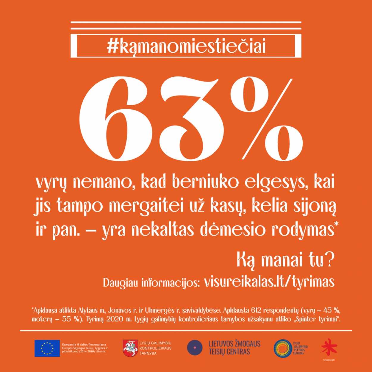 63 proc. vyrų nemano, kad berniuko elgesys, kai jis tampo mergaitei už kasų, kelia sijoną ir pan., yra nekaltas dėmesio rodymas. Šiuos ir kitus sociologinio nuostatų tyrimo duomenis ateinančias dvi savaites bus galima išvysti miesto gatvėse.