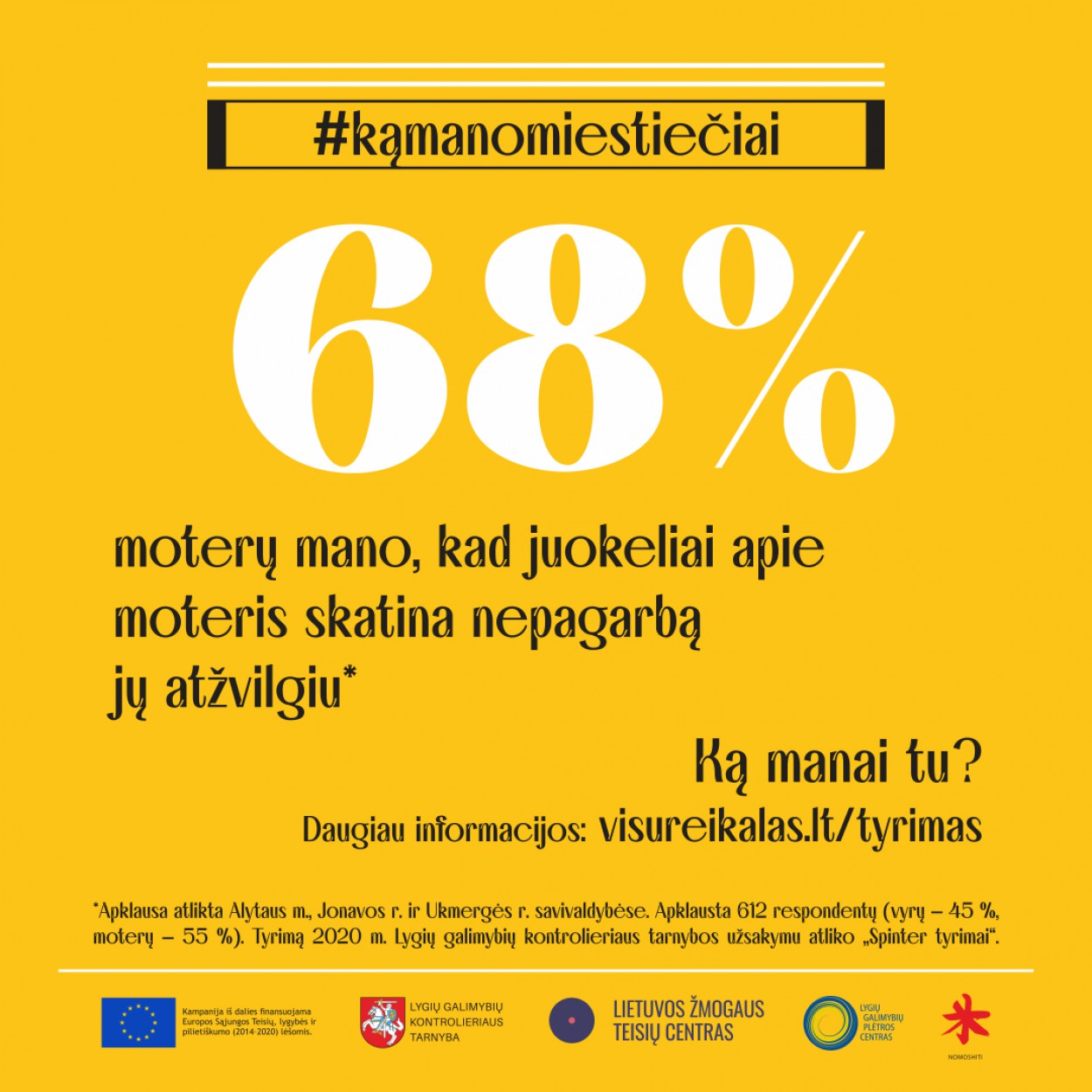 Lygių galimybių kontrolieriaus tarnyba kreipiasi į Jonavos gyventojus ir pradeda socialinę kampaniją „Ką mano miestiečiai“. Ja siekiama keisti prievartinę kontrolę pateisinančius stereotipus bei stiprinti vyrų smurto prieš moteris artimoje aplinkoje prevenciją.