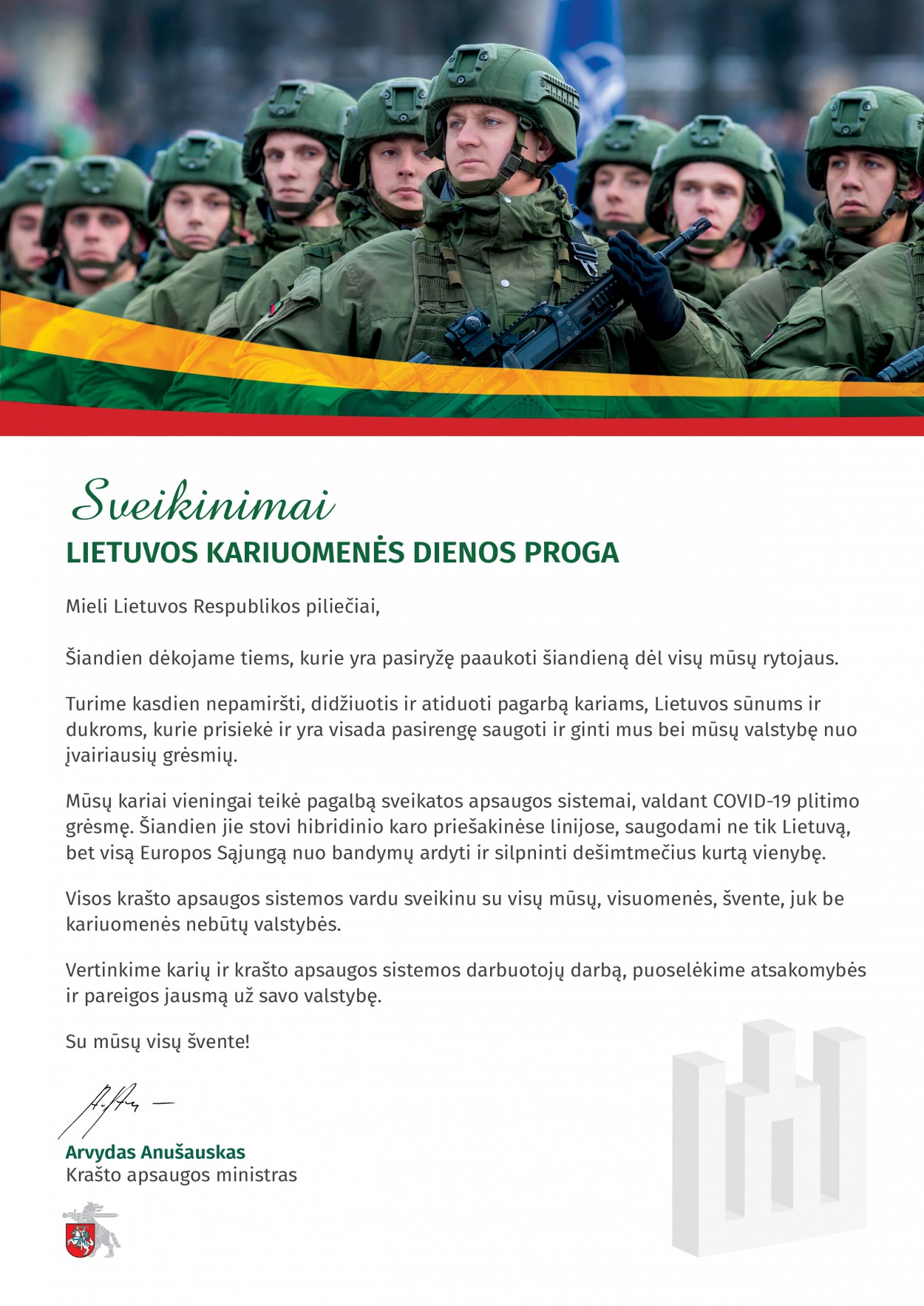 Mūsų kariai vieningai teikė pagalbą sveikatos apsaugos sistemai, valdant COVID-19 plitimo grėsmę. Šiandien jie stovi hibridinio karo priešakinėse linijose, saugodami ne tik Lietuvą, bet visą Europos Sąjungą nuo bandymų ardyti ir silpninti dešimtmečius kurtą vienybę.