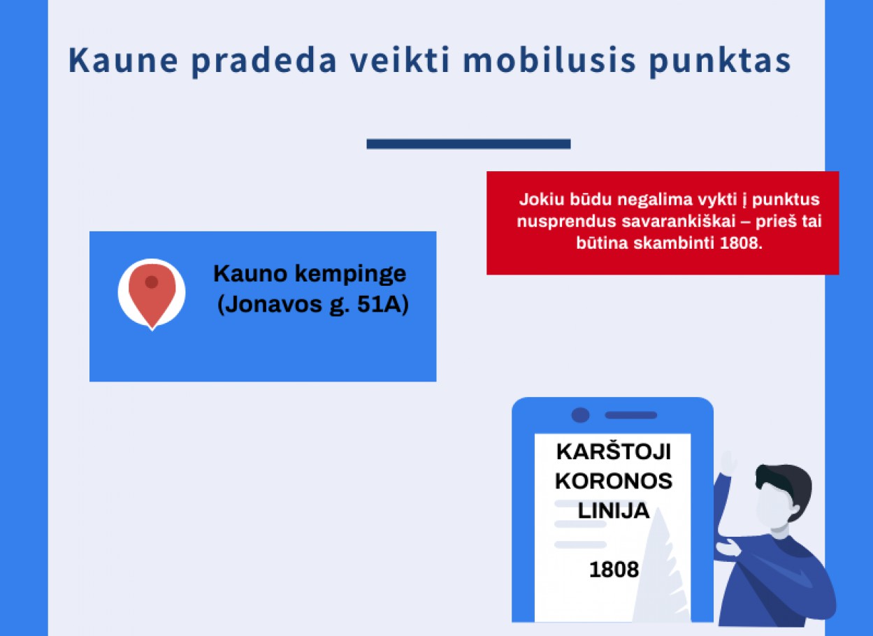 Darbui paruoštas ir jau šiandien, nuo 12 val., Kaune pradeda veikti mobilusis punktas, kuriame pacientams bus imami ėminiai tyrimams dėl naujojo koronaviruso (COVID-19). Punktas įkurtas Kauno kempinge (Jonavos g. 51A).