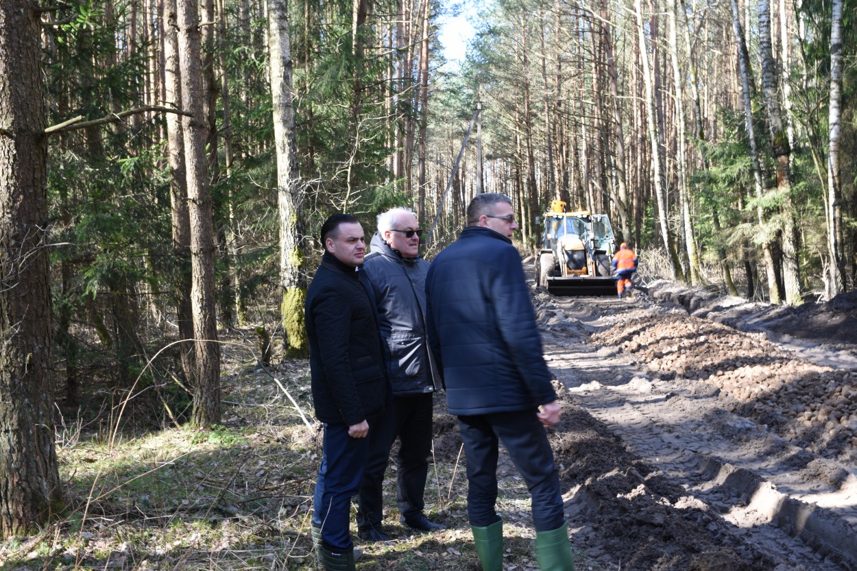 Nuotraukoje - Mero pavaduotojas Erlandas Andrejevas, seniūnas Algirdas Paplonskis ir administracijos direktorius Valdas Majauskas prie tvarkomo kelio