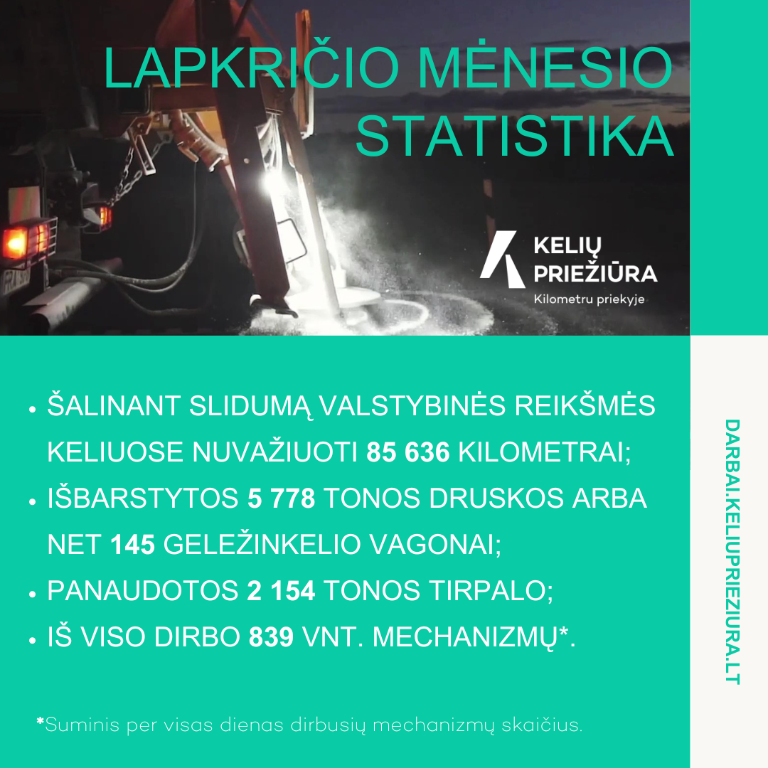 Bendrovės duomenimis, lapkritį valstybinės reikšmės keliuose nuvažiuota daugiau kaip 85 tūkst. kilometrų atliekant slidumo šalinimo darbus. Šiam tikslui panaudota 5 778 tonos druskos – tai prilygsta maždaug 145 geležinkelio vagonų kroviniui. Be to, keliuose panaudotos 2 154 tonos tirpalo, o valstybinės reikšmės keliuose bendroje sumoje dirbo 839 mechanizmai.