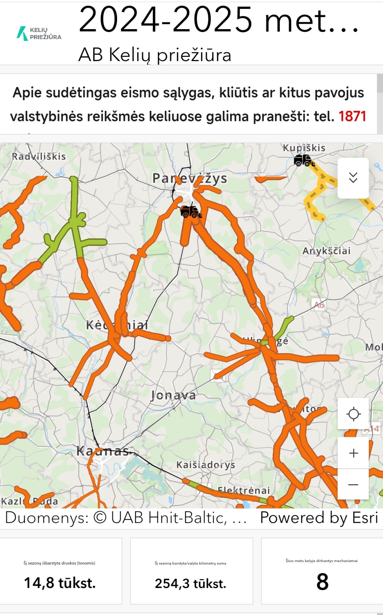 Be to, kviečiame stebėti „Kelių priežiūros“ mechanizmų darbą žiemos darbų žemėlapyje. Jame realiu laiku galite matyti „Kelių priežiūros“ mechanizmų atliktą darbą, pastarųjų ir būsimų 8 valandų maršrutus. Šis įrankis skirtas padėti vairuotojams suprasti kelių priežiūros darbų apimtis, panaudotus resursus, valant ir/ar barstant nuvažiuotą atstumą, taip pat leidžia susiplanuoti dar saugesnes keliones. Žiemos darbų žemėlapį galite rasti ziema.keliuprieziura.lt