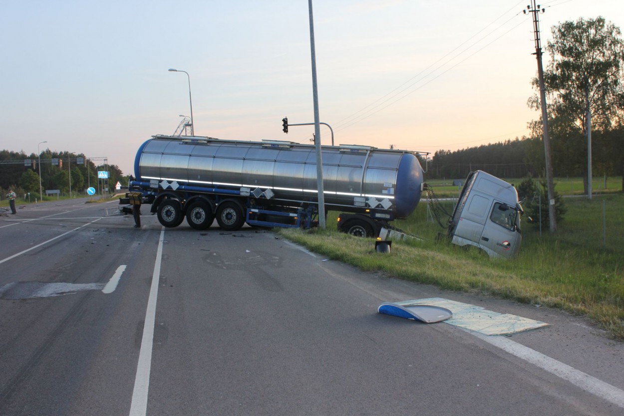 Vilkikas, ant kurio cisternos buvo užrašas apie naftos produktus, išvertė šviesoforą, tačiau jo vairuotojas nenukentėjo.