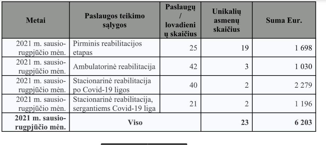 Valstybinės ligonių kasos, portalo jonavoszinios.lt prašymu, nurodo gydymo įstaigų pateiktus duomenis apie 2021 m. sausio-rugpjūčio mėn. suteiktas Privalomojo sveikatos draudimo fondo (PSDF) lėšomis apmokamas reabilitacijos, susijusias su Covid-19 liga, paslaugas Jonavos r. sav. prisirašiusiems asmenims.