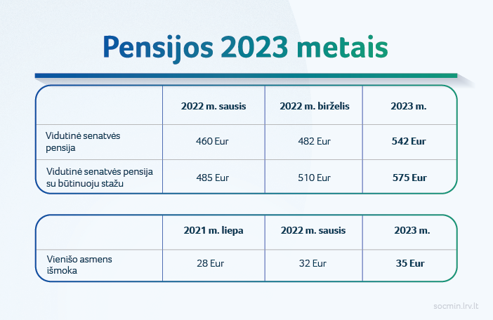 Jeigu ministerijos siūlymams bus pritarta, bendroji pensijos dalis 2023 m. didės apie 9 proc., o individualioji – beveik 15 proc. Per metus vidutinė pensija turint būtinąjį stažą vidutiniškai didėtų daugiau nei 12 proc. arba 65 eurais.