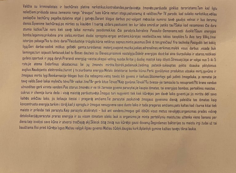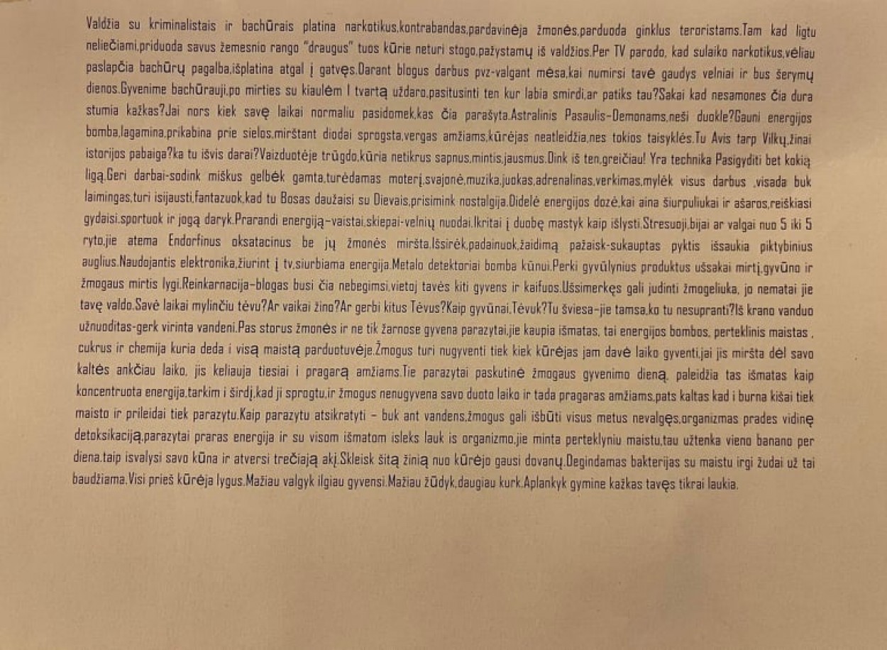 ,,Valdžia su kriminalistais ir bachūrais platina narkotikus, kontrabandas, pardavinėja žmones, parduoda ginklus teroristams. Tam, kad liktų neliečiami, priduoda savus žemesnio rango ,,draugus", tuos kurie neturi stogo, pažįstamų iš valdžios", - tai tik dalis skaitytojus pasiekusio rašto.