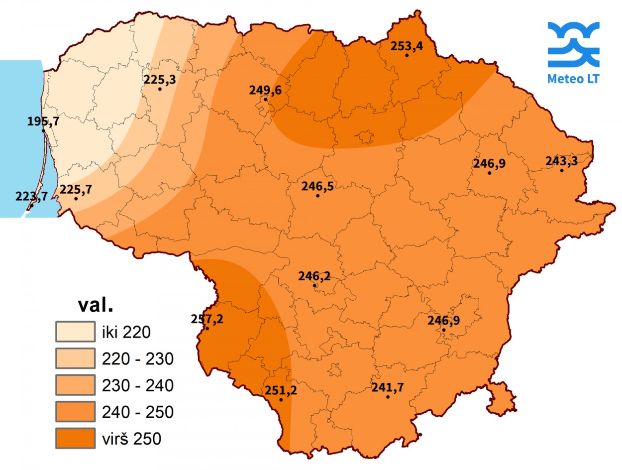 Įdomu tai, jog 2025 m. gegužę (232,2 val.), birželį (236,1 val.), liepą (216,6 val.) ir rugpjūtį (235,6 val.), kurie paprastai yra labiausiai saulėti metų mėnesiai, Saulės spindėjimo trukmė buvo truputį mažesnė nei šių metų kovą.