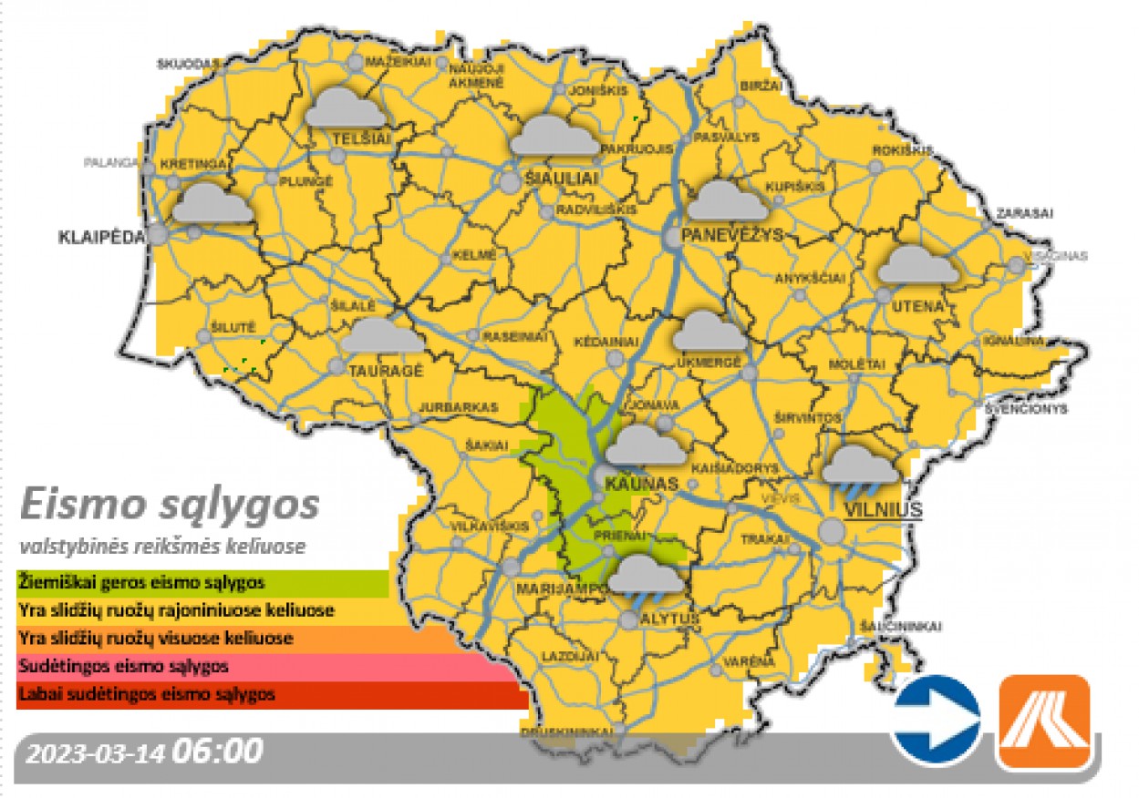 Mažesnio eismo intensyvumo rajoniniai keliai didžiojoje šalies dalyje išlieka su pažliugusio ar prispausto sniego provėžomis, slidūs. Vairuotojų, vykstančių šiais keliais, prašome būti atidiems ir neskubėti bei laikytis saugaus atstumo.