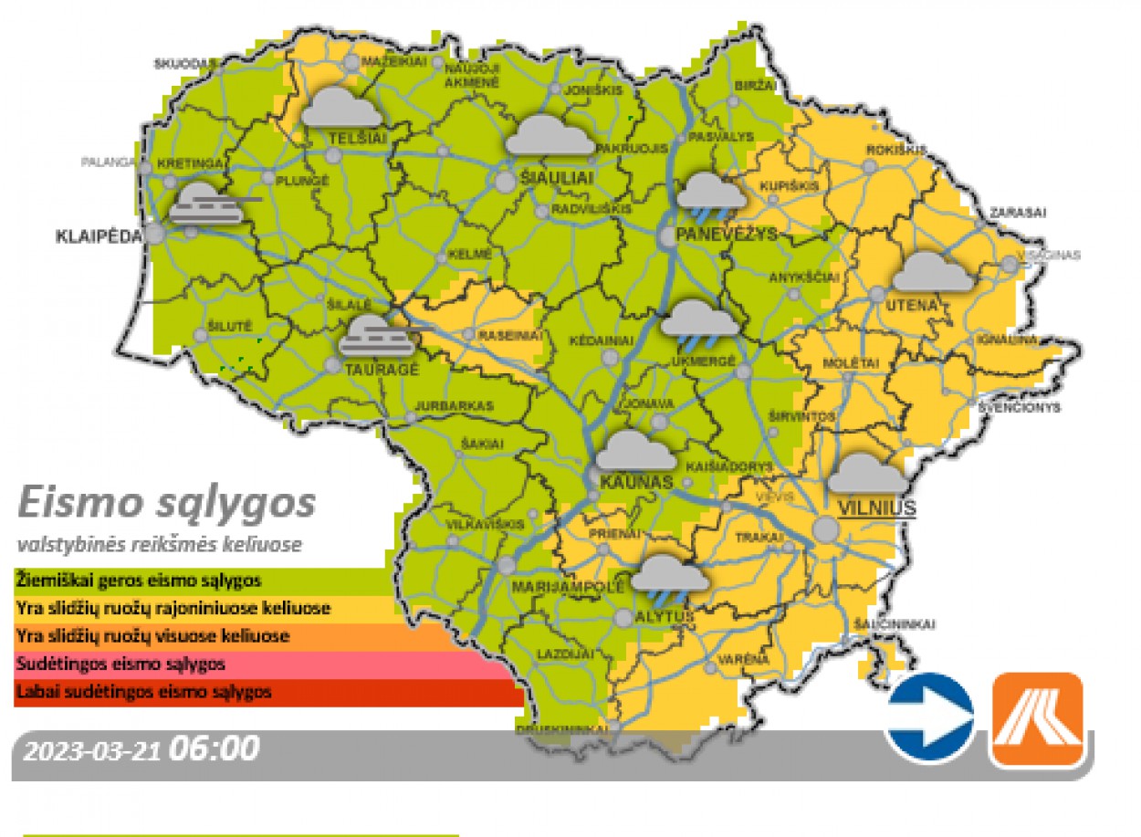 Mažesnio eismo intensyvumo rajoniniuose keliuose vietomis, daugiausia rytų Lietuvoje, vis dar išlieka provėžų, pažliugusio, prispausto sniego.