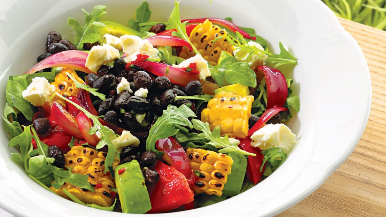 Vasariškos salotos su kukurūzais, paprika ir aštriu padažu