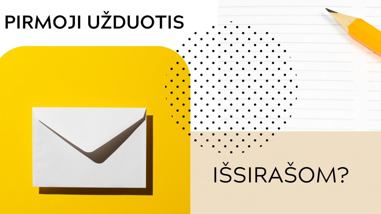Skelbiame pirmąją užduotį. Kviečiame parašyti laišką, kurio niekada neišsiųsite ir neperskaitysite adresatui. Galite tiesiog pradėti rašyti ir leisti, kad pats rašymas jus nuneštų ten, kur neša. Svarbu, kad laiškas turėtų kreipinį ir, kad jį kažkas pasirašytų. Laišką galite rašyti sau ar savo asmenybės dalims, ar konkretiems jausmams. Laišką galite rašyti savo artimiesiems ar nesutiktiems žmonės. Taip pat galite mintyse išsirinkite asmenį, kuriam norite parašyti laišką: tai gali būti realus asmuo arba Jus įkvėpęs personažas, filmo veikėjas, žmogus, kurio gyvai nesutikote, bet turite ką jam pasakyti. Parašykite jam/jai laišką. Apie ką jis bus? Tiesiog leiskite sau parašyti laišką, nevaržant savęs ir būnant savimi.