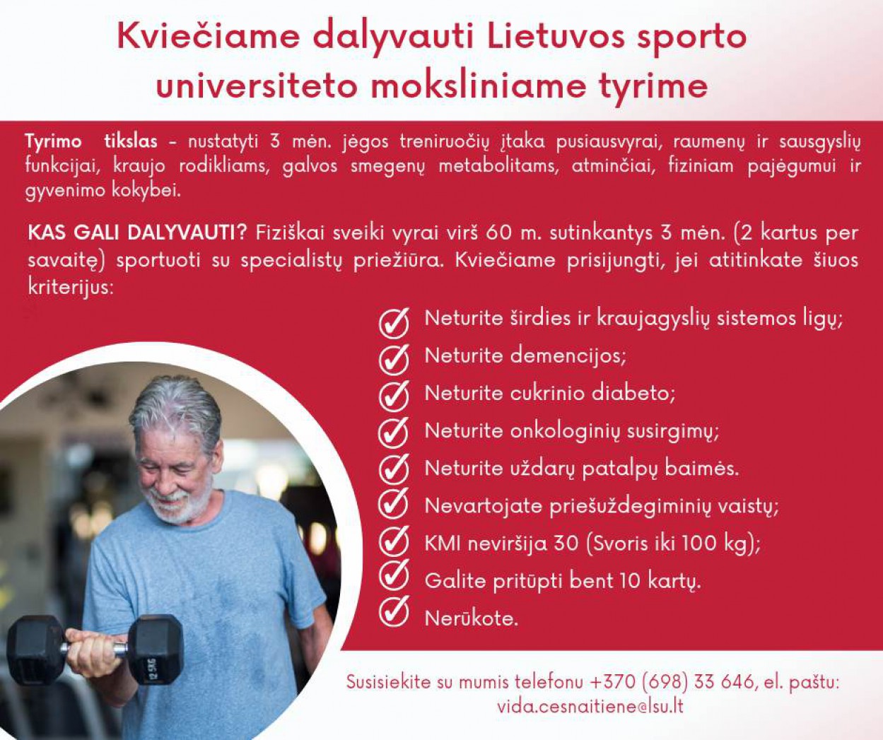 Šiuo metu vykdomų tyrimų metu siekiama suprasti kaip didėjanti raumenų jėga įtakoja galvos smegenų sveikatą ir kognityvinę funkciją. Tokiems tyrimams atlikti ieškome vyresnių nei 60 metų vyrų norinčių 3 mėn. reguliariais sportuoti. Jeigu nerūkote ir neturite lėtinių ligų bei norite prisijungti prie tyrimo kviečiame susisiekti su mumis tel. +370 (698) 33 646 arba el. paštu vida.cesnaitiene@lsu.lt