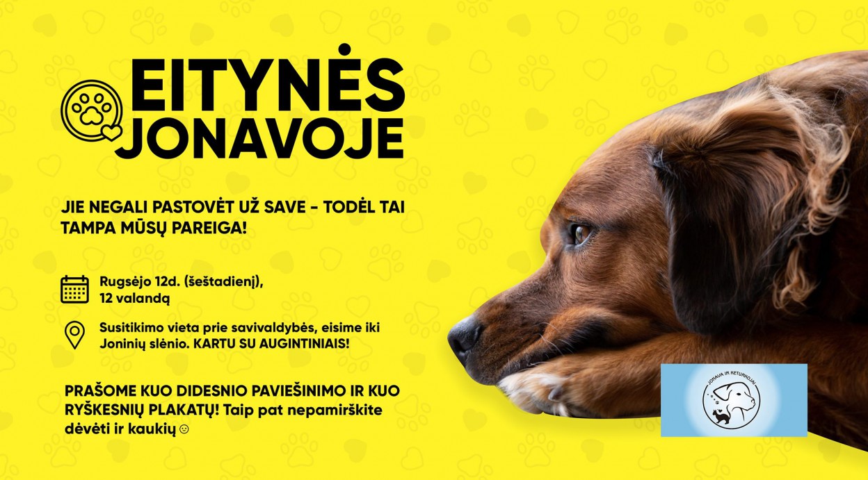 ,,Rinksimės prie Jonavos rajono savivaldybės, adresu Žeimių g. 13, Jonava. Kviečiame visus prisijungti ir dalyvauti draugiškose eitynėse už gyvūnų teises. Taip siekiant padėti sustabdyti jau seniai nevaldomą situaciją su gyvūnų daugyklomis, nelegaliais veislynais, žiauriu elgesiu prieš keturkojus.