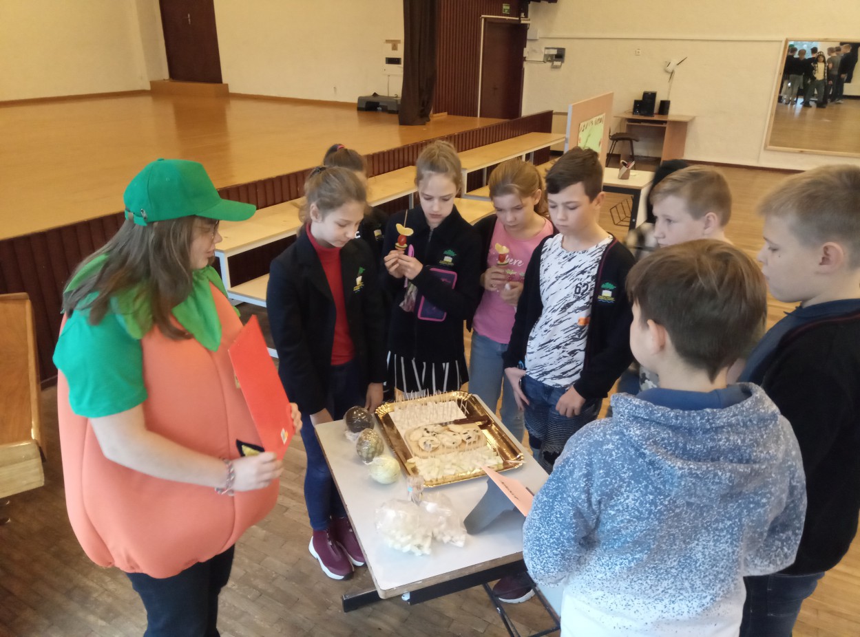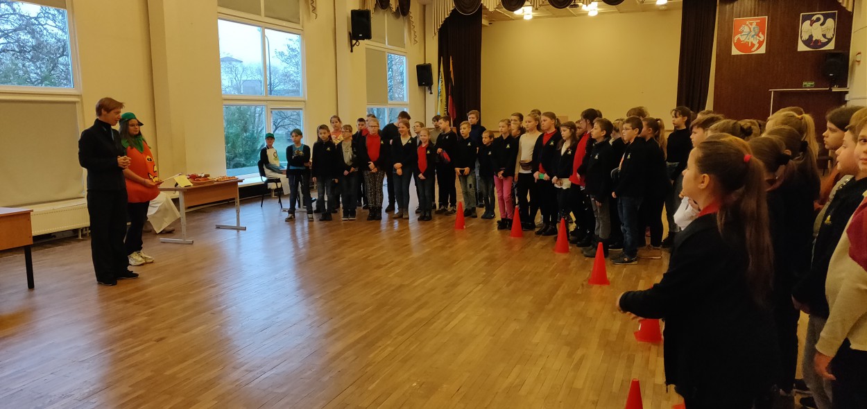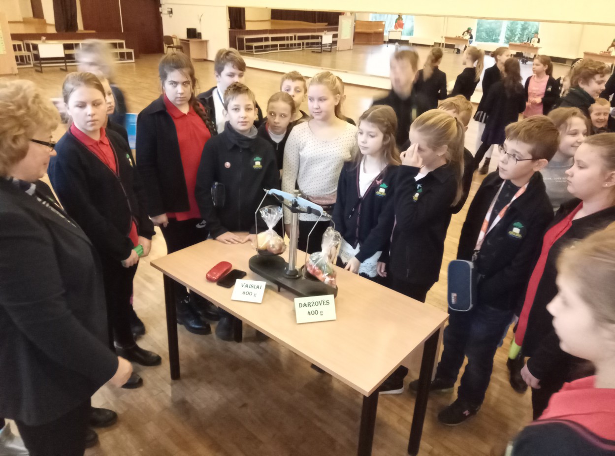 Mokyklos salėje penktokai rinko populiariausias, kasdien namuose vartojamas daržoves ir vaisius, galėjo vizualiai įvertinti daug ar mažai 400g vaisių ir 400g daržovių. Akį traukė spalvingi vaisių ir daržovių vėrinukai. Ant jų puikavosi agurkai, pomidorai, morkos, vynuogės ir apelsinai. Taip pat popietės organizatoriai kvietė skanauti obuolių ir kriaušių. Kuo įvairesnes daržoves ir vaisius valgysime, tuo geriau bus patenkinami mūsų organizmo poreikiai. Juk maisto įvairovė yra raktas į sveiką mitybą. Vaikai mielai valgė vaisius ir daržoves, dalinosi savo pastebėjimais apie mėgstamiausius ir ne taip pamėgtus vaisius ir daržoves. Daug smalsuolių ir ragautojų sulaukė aklasis „Moliūgo“ iššūkis, kur paragavus reikėjo atspėti retesnius vaisius ir daržoves. Nors nedaug mylėtojų sulaukė juodasis ridikas ir kaliaropė, o egzotiškasis anonos vaisius kai kuriems pasirodė per daug saldus, paragauti buvo verta. Pasibaigus pamokai penktokai smagiai dalijosi įspūdžiais ir džiaugėsi, kad daugiau sužinojo apie vaisių ir daržovių svarbą sveikatai, susipažino su retesnėmis daržovėmis, žadėjo kasdien valgyti kuo įvairesnių vaisių ir daržovių. Tikime, kad nuo šiol parduotuvėje jie atkreips dėmesį ir į kitas, ant mūsų stalo ne tokias dažnas daržoves ir vaisius ir norės jų paragauti.