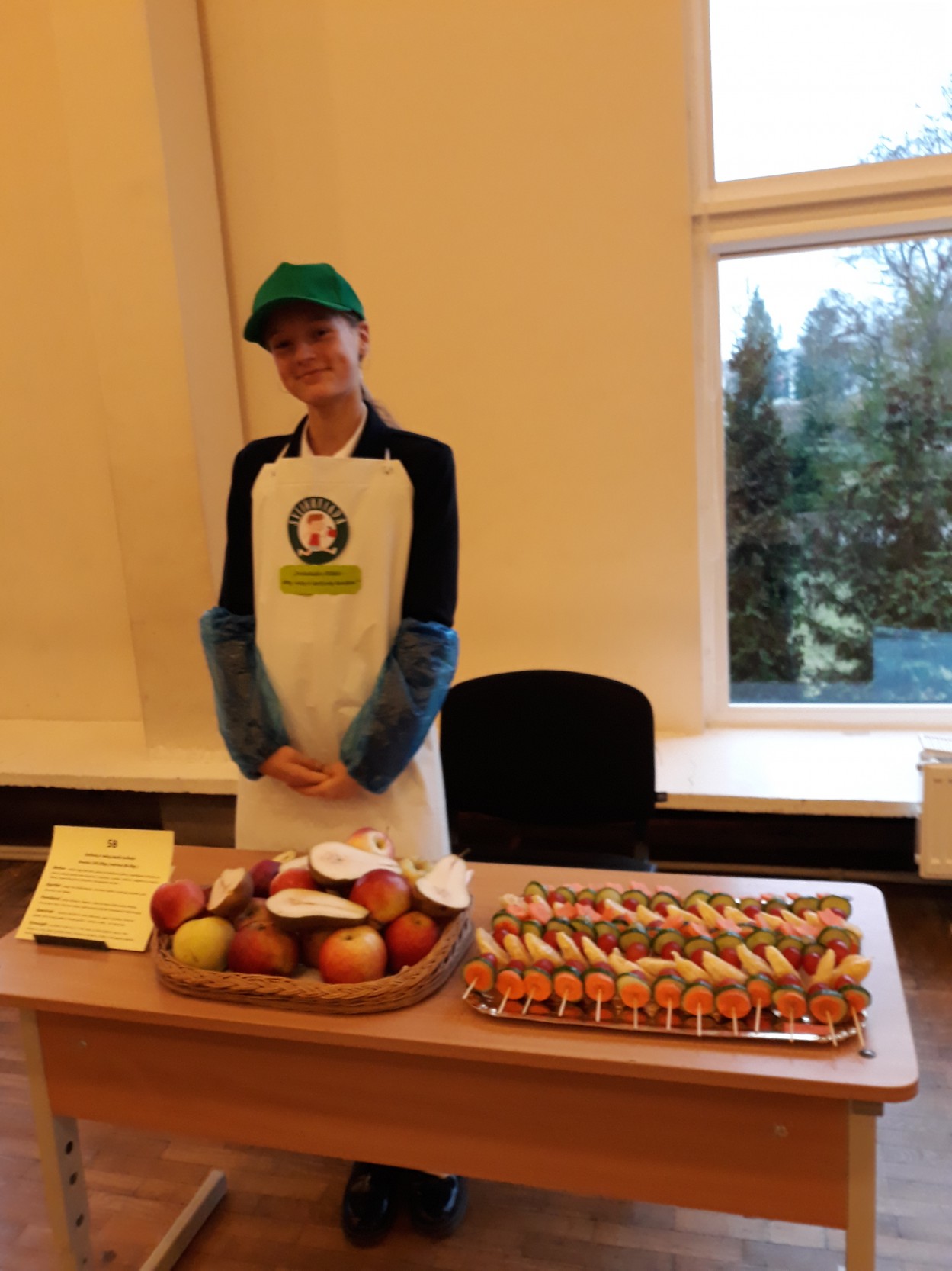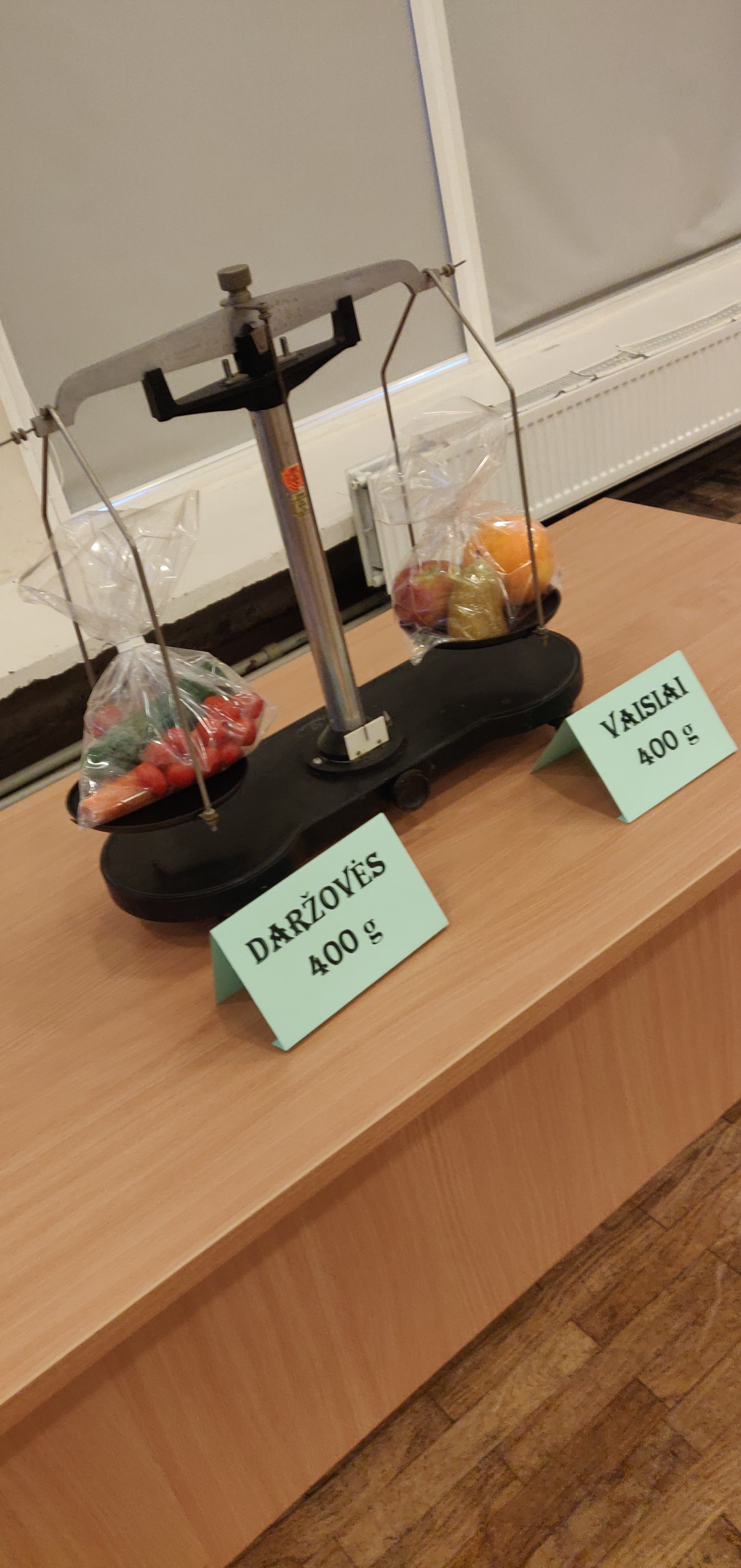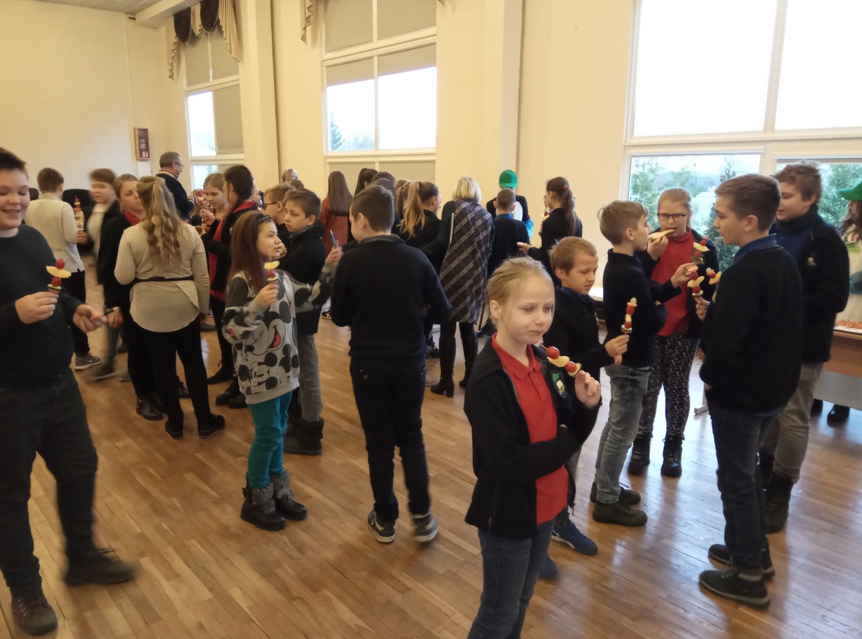 Mokyklos salėje penktokai rinko populiariausias, kasdien namuose vartojamas daržoves ir vaisius, galėjo vizualiai įvertinti daug ar mažai 400g vaisių ir 400g daržovių. Akį traukė spalvingi vaisių ir daržovių vėrinukai. Ant jų puikavosi agurkai, pomidorai, morkos, vynuogės ir apelsinai. Taip pat popietės organizatoriai kvietė skanauti obuolių ir kriaušių. Kuo įvairesnes daržoves ir vaisius valgysime, tuo geriau bus patenkinami mūsų organizmo poreikiai. Juk maisto įvairovė yra raktas į sveiką mitybą. Vaikai mielai valgė vaisius ir daržoves, dalinosi savo pastebėjimais apie mėgstamiausius ir ne taip pamėgtus vaisius ir daržoves. Daug smalsuolių ir ragautojų sulaukė aklasis „Moliūgo“ iššūkis, kur paragavus reikėjo atspėti retesnius vaisius ir daržoves. Nors nedaug mylėtojų sulaukė juodasis ridikas ir kaliaropė, o egzotiškasis anonos vaisius kai kuriems pasirodė per daug saldus, paragauti buvo verta. Pasibaigus pamokai penktokai smagiai dalijosi įspūdžiais ir džiaugėsi, kad daugiau sužinojo apie vaisių ir daržovių svarbą sveikatai, susipažino su retesnėmis daržovėmis, žadėjo kasdien valgyti kuo įvairesnių vaisių ir daržovių. Tikime, kad nuo šiol parduotuvėje jie atkreips dėmesį ir į kitas, ant mūsų stalo ne tokias dažnas daržoves ir vaisius ir norės jų paragauti.