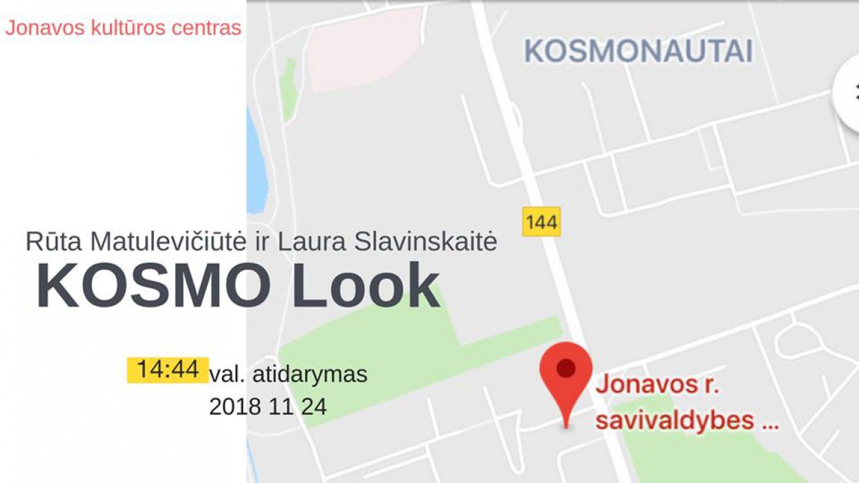 Kosmo look (Kosmo žvilgsnis) - tai projektas apie tiesą ir kitų matymo perspektyvų galimybę. Projekto autorės - Laura Slavinskaitė ir Rūta Matulevičiūtė tapybos, instaliacijos ir video medijomis sukuria Jonavos miesto įkvėptą ir specialiai šiai lokacijai skirtą situaciją.