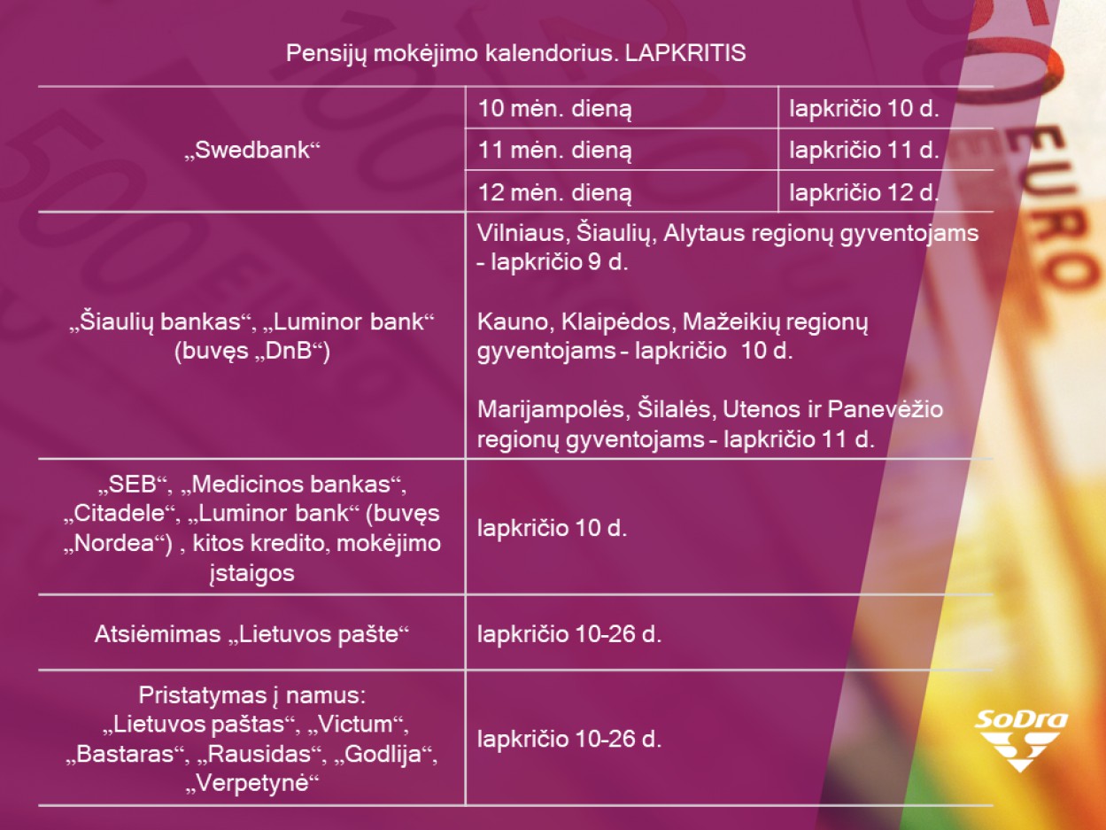 Lapkritį pensijos pasieks gavėjus kaip įprasta. Gyventojai, sulaukiantys savo pensijų pavedimu, priklausomai nuo to, kurio banko paslaugomis naudojasi ir kuriame mieste gyvena, gaus pensijas nuo lapkričio 9 iki 12 dienos. Tie gyventojai, kuriems pensija pirmą kartą paskirta vėliau nei 2012 m. vasarį ir gavėjai, kuriems pensijos 2011 m. gruodį arba 2012 m. rugsėjį mokėtos 27–28 dienomis, gaus išmokas lapkričio 19-20 dienomis.
