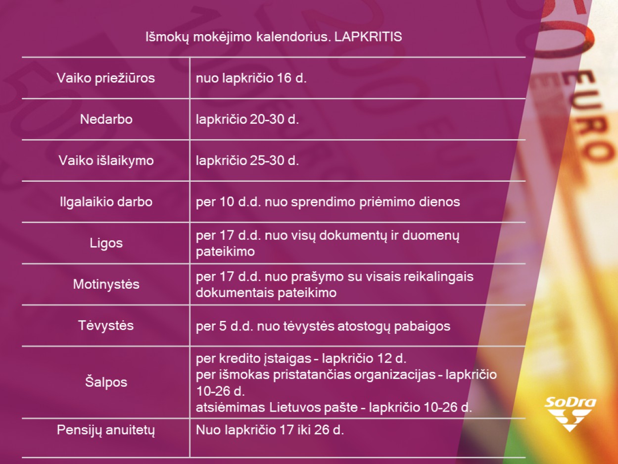 Auginantys vaikus iki dvejų metų sulauks išmokų nuo lapkričio 16 d., o negaunantys viso ar dalies priteisto išlaikymo – nuo lapkričio 25 iki 30 dienos.