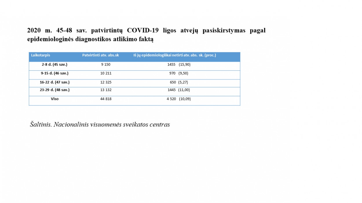 Vertinant ištirtų atvejų skaičių, nuo visų lapkričio mėnesį nustatytų atvejų skaičiaus, neištirta 4520 atvejų (t. y. 10 proc.). Absoliuti dauguma jų – 4036 atvejai arba 90 proc. – neištirti todėl, kad NVSC neturi šių žmonių kontaktinių duomenų ir negali su jai susisiekti.
