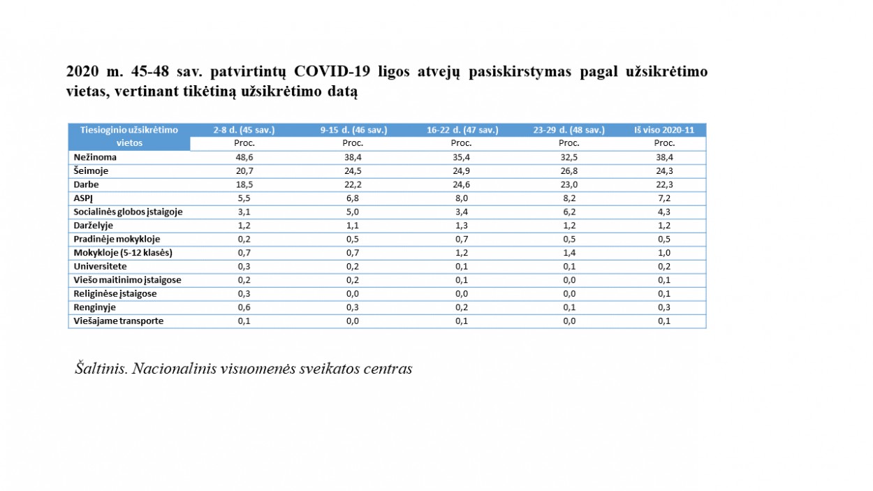 Lapkritį registruotas intensyvus koronaviruso infekcijos (COVID-19) plitimas visuomenėje – nuo lapkričio 2 iki 29 dienos patvirtinti 44 818 atvejai, t. y. keturis kartus daugiau nei spalį ir dvidešimt penkis kartus daugiau nei rugsėjį. Epidemiologinių tyrimų metu surinkti duomenys rodo, kad lapkričio mėnesį atvejų struktūroje reikšmingą dalį sudaro atvejai, susiję su užsikrėtimais šeimose, darbe, taip pat – gydymo bei palaikomojo gydymo įstaigose. Tuo metu, daugiau nei trečdalis žmonių, kuriems infekcija patvirtinta lapkritį, negalėjo nurodyti, kur užsikrėtė.