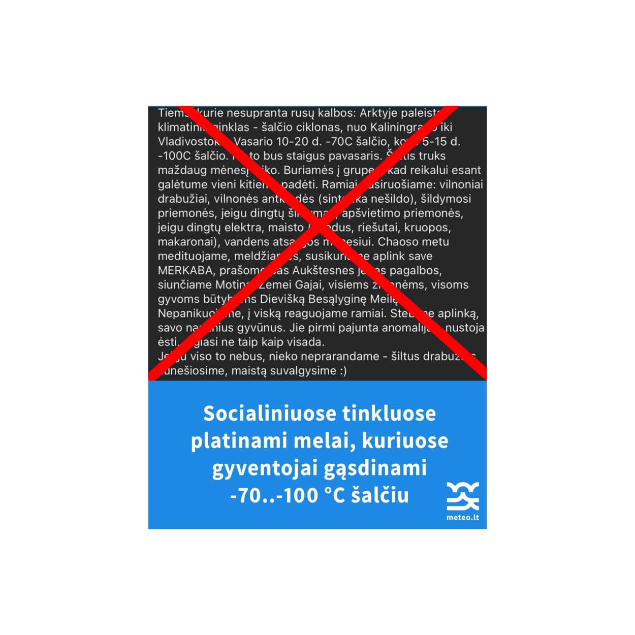 Lapkritį–gruodį gyventojai gąsdinti „nuodingu“ rūku bei teiginiais, jog žiemą visiškai dėl jo nepasirodys Saulė. Sausio viduryje internete buvo platinami dirbtiniu intelektu sugeneruoti vaizdai iš Kamčiatkos pusiasalio. Na, o prieš keletą dienų paskleista melaginga žinutė apie klimatinį ginklą su neregėtu šalčiu. Esą temperatūra Lietuvoje gali nukristi iki 70 ar net iki 100 laipsnių šalčio. Tai yra tik dar viena internete pasirodžiusi apgaulė, skelbia Lietuvos hidrometeorologijos tarnyba (LHMT).