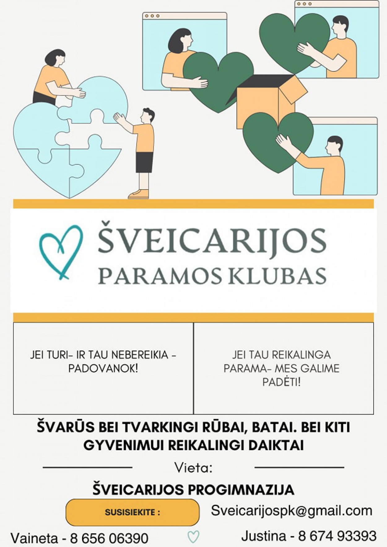 Paramos klubas labiausiai orientuojasi į sezoninius rūbus ir avalynę. Aukojimas neturi numatytos tikslios datos, ar konkrečios savaitės dienos - norintys paaukoti gali susisiekti su progimnazijos administracija nurodytu numeriu, susitarti dieną ir laiką, kada jiems patogu.
