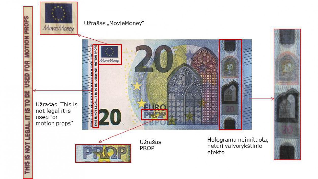 „Akivaizdžiausias dalykas – ant pačių banknotų yra užrašai „copy“, „movie money“ ar „prop copy“. Vis dėlto ne tiek svarbu ieškoti tokių užrašų, nes jie gali ir keistis, o atkreipti dėmesį į tikrų pinigų apsaugos požymius, pavyzdžiui, popieriaus kokybę. Nors šiuo metu gyventojai stengiasi pinigus (kaip ir bet kokius kitus paviršius) liesti kuo mažiau, tačiau net ir trumpo kontakto metu galima pajusti, kad tai ne standus ir šiugždantis tikrų banknotų popierius, o paprastas kanceliarinis popierius“, – sako Ramunė Juzėnienė, Lietuvos banko grynųjų pinigų ekspertė.