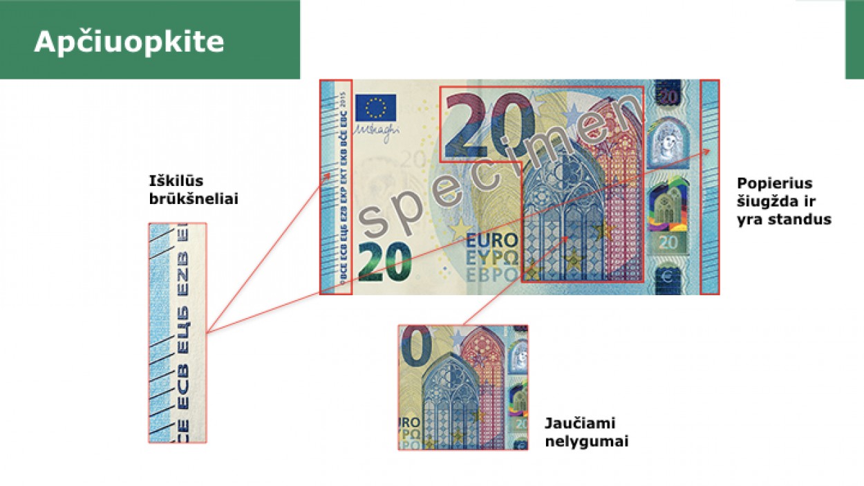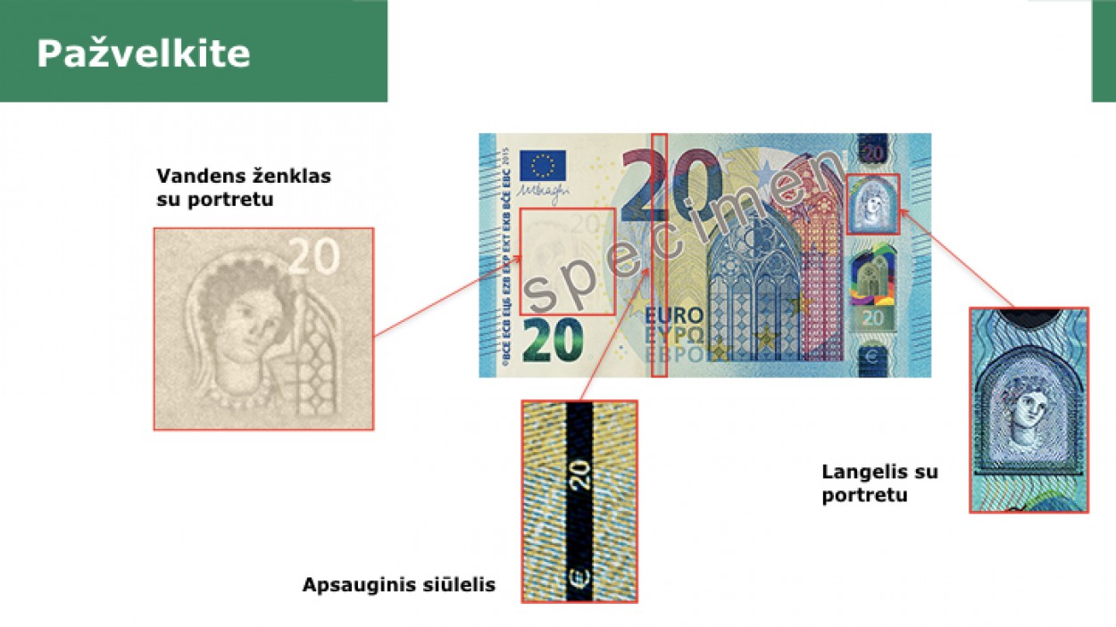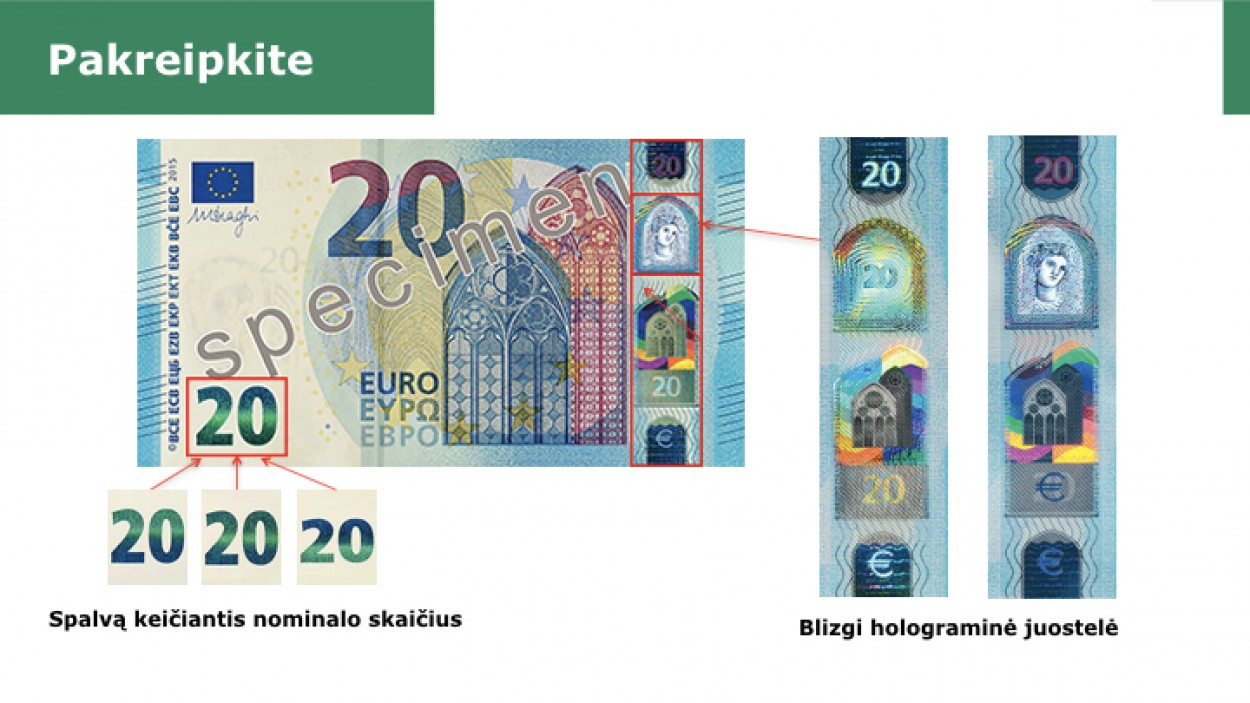 Lietuvos bankas primena, kad tikrus eurų banknotus nuo padirbtų lengva atskirti pagal „apčiuopkite – pažvelkite – pakreipkite“ metodą. Daugiau informacijos apie kiekvieno nominalo banknotą rasite čia.