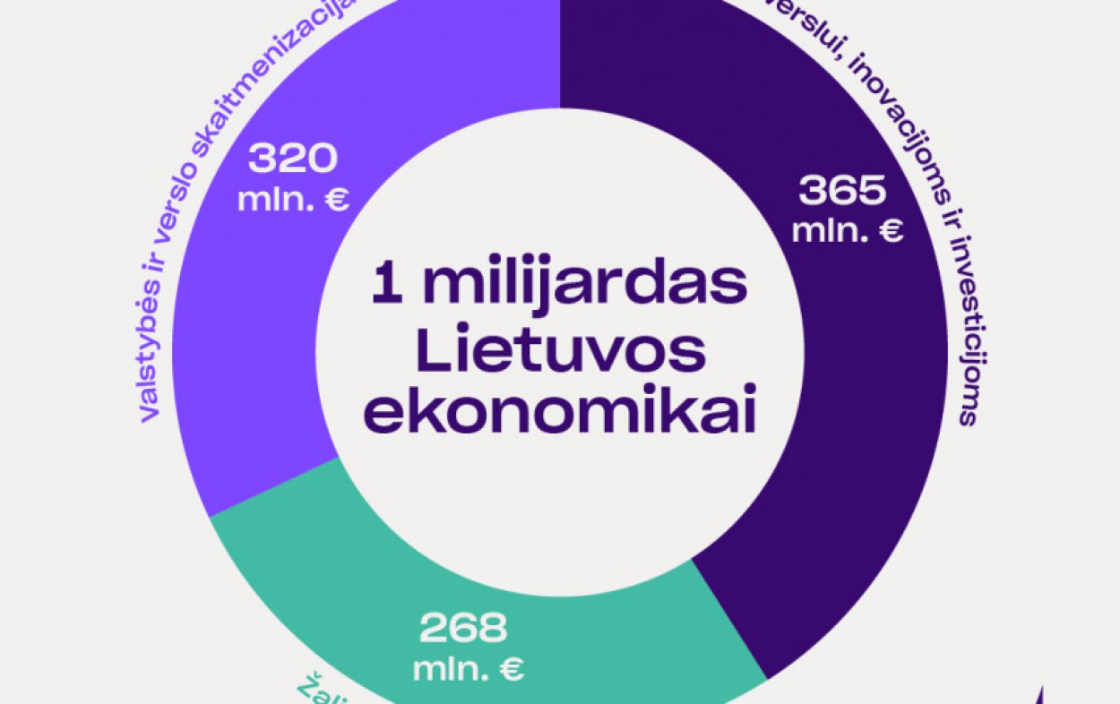 Šis beveik 1 mlrd. vertės Lietuvos ekonomikos planas susideda iš 3 dalių. Iki 2023 m. pabaigos apie 365 mln. eurų numatyta verslui, inovacijoms ir investicijoms, 320 mln. eurų – valstybės ir verslo skaitmenizacijai, 268 mln. eurų – žalesnei ekonomikai.
