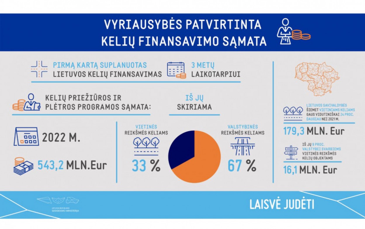 Palyginti su praėjusiais metais, šiemet Lietuvos keliams skiriama apie 12 mln. eurų daugiau KPPP lėšų: 2021 m. buvo skirta 531,6 mln. eurų, šiemet – beveik 543,2 mln. eurų. Lietuvos savivaldybės šiemet vietiniams keliams gaus vidutiniškai 24 proc. daugiau lėšų nei pernai.
