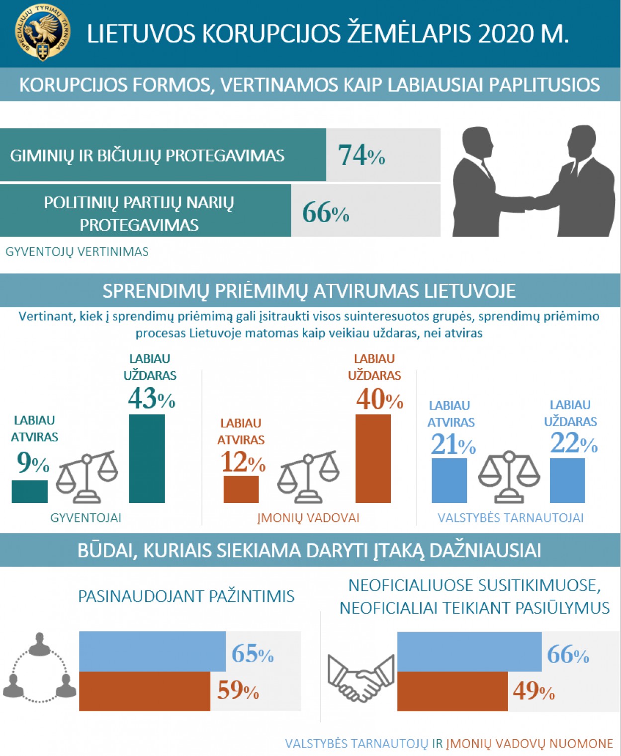 2020 metų duomenimis, visų trijų tikslinių grupių nurodytas labiausiai korumpuotų institucijų ketvertukas yra tas pats, kaip ir 2019 metais: gydymo įstaigos, teismai, Seimas ir savivaldybės. Visuomenėje, kaip labiausiai paplitusios korupcijos formos, yra įvardijamos giminaičių ir bičiulių protegavimas bei politinių partijų narių protegavimas.