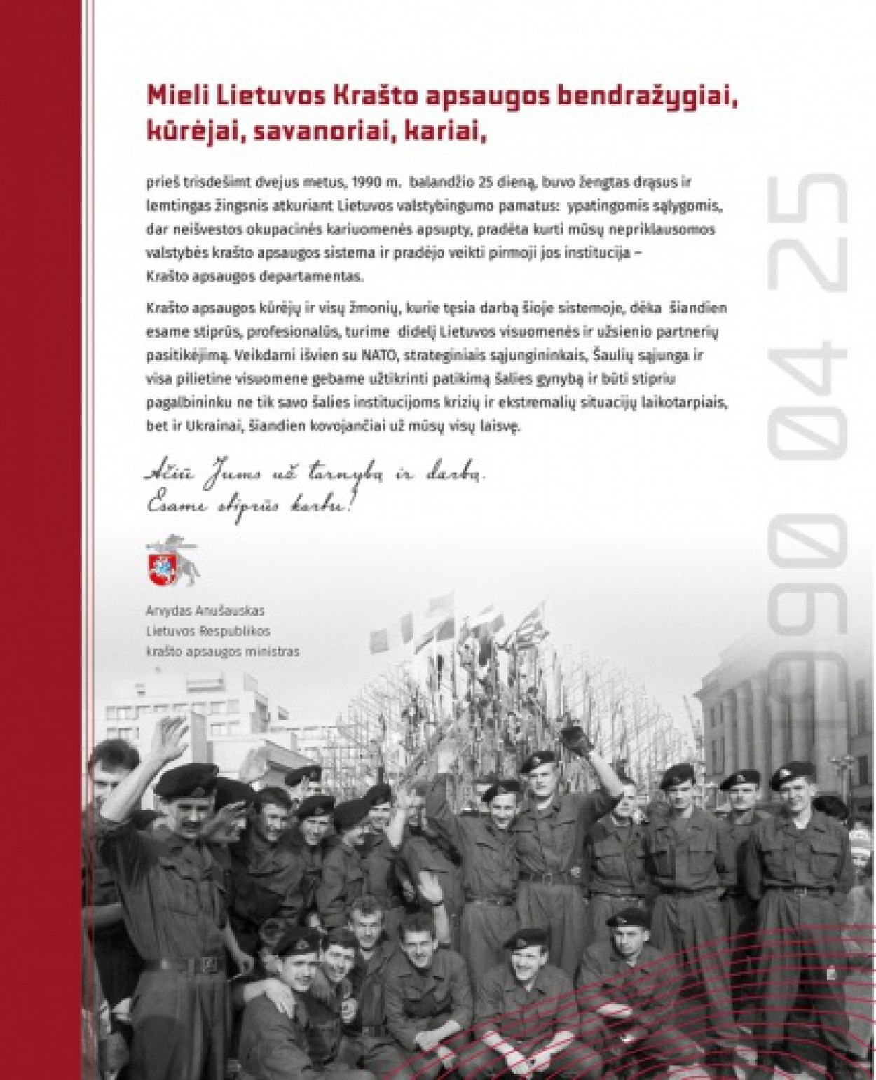 „Karo Ukrainoje kontekste dar labiau suprantame laisvės ir nepriklausomybės vertę, dar labiau matome ir jaučiame savo darbo ir tarnybos krašto apsaugos sistemoje prasmę. Krašto apsaugos kūrėjų, prieš 32 metus padėjusių KAS pamatus, ir visų žmonių, kurie šiandien tęsia darbą šioje sistemoje, dėka šiandien esame stiprūs, profesionalūs. Turime aukštą Lietuvos visuomenės ir užsienio partnerių pasitikėjimą. Veikdami išvien su NATO, strateginiais sąjungininkais, Šaulių sąjunga, kitomis nevyriausybinėmis organizacijomis ir visa pilietine visuomene gebame užtikrinti patikimą šalies gynybą ir būti stipriu pagalbininku ne tik savo šalies institucijoms krizės ir ekstremalių situacijų laikotarpiais, bet ir Ukrainai, šiandien kovojančiai už mūsų visų laisvę“, – sako ministras A. Anušauskas.