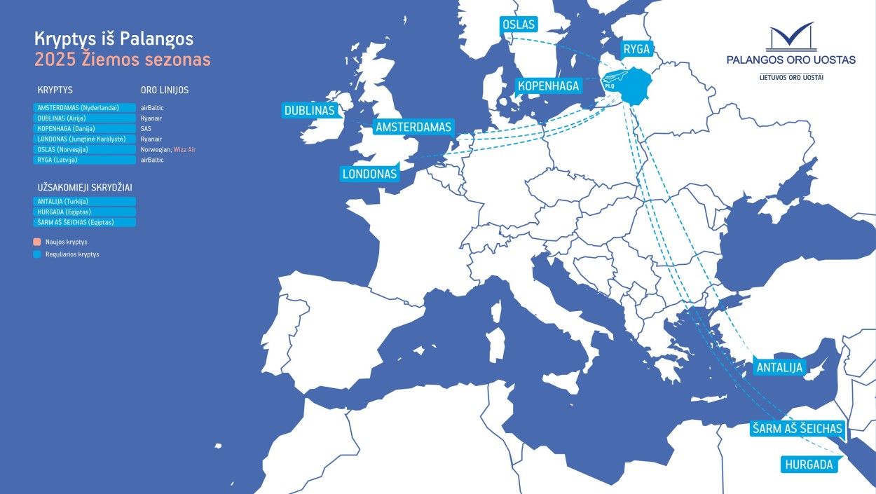 Palangos oro uosto pasiūlą žiemos sezonu nuo gruodžio 10 dienos papildys kompanijos „Wizz Air“ skrydžiai į Norvegijos sostinę Oslą. Jie vyks du kartus per savaitę. Sklandžias verslo ar užsienyje dirbančių lietuvių keliones namo užtikrins tiesioginiai skrydžiai į Londoną, Dubliną, Amsterdamą, Kopenhagą. Skrydžiai į Kopenhagą ir į Rygą šį žiemos sezoną bus patys dažniausi iš Palangos oro uosto.