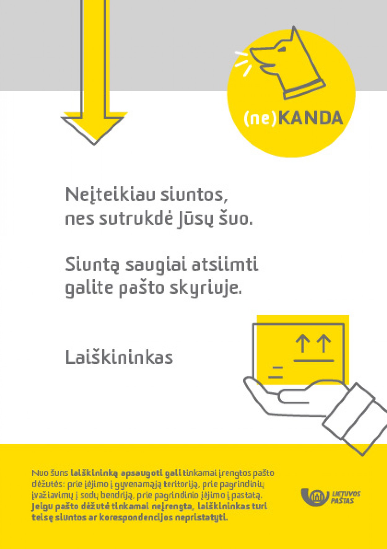 „Suprantame, kad gyventojai nori apsaugoti savo turtą, tad norime priminti, kad nuo šuns apsaugoti laiškininką galima tinkamai įrengus pašto dėžutes. LR Pašto įstatymas numato, kad laiškų dėžutės turi būti įrengtos laiškininkams lengvai prieinamose vietose – pavyzdžiui, ant tvoros taip, kad šuo nepasiektų laiškininko. Gyventojai, kurių kiemuose šunys dažniausiai būna nepririšti, Lietuvos pašto skyriuose gali nemokamai pasiimti specialų lipduką – jį užklijavę ant tvoros ar vartelių, apie galimą grėsmę informuos korespondenciją atnešusį laiškininką“, – sako Lietuvos pašto Korporatyvinių reikalų departamento vadovė V. Budrienė.