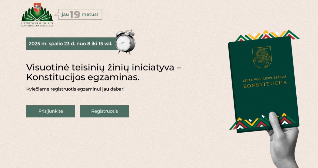 Spalio 23-iąją visi kviečiami dalyvauti tradiciniame Konstitucijos egzamine – pasitikrinti žinias apie Konstituciją ir prisiminti, ką reiškia būti piliečiu teisinėje valstybėje. Ši pilietinė iniciatyva kasmet suburia tūkstančius žmonių – nuo moksleivių iki senjorų iš Lietuvos ir viso pasaulio, siekiančių geriau pažinti svarbiausią valstybės dokumentą.