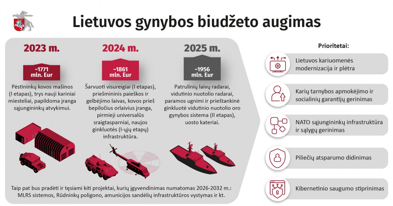 LR Vyriausybės pateiktame ir LR Seimo šiuo metu svarstomame 2023 m. valstybės biudžeto projekte numatoma toliau stiprinti nacionalinius gynybos pajėgumus. Planuojami 2023 m. asignavimai Krašto apsaugos ministerijai (KAM) yra 1771 mln. eurų – tai yra beveik 124 mln. eurų daugiau nei 2022 m. Šiais metais šalies saugumui ir gynybai skirti asignavimai siekė 1647,4 mln. eurų, įvertinus metų eigoje papildomai skirtus 446 mln. eurų. Kitų metų biudžeto projekte išlaikomas šiemet pasiektas 2,52 proc. BVP dydis.