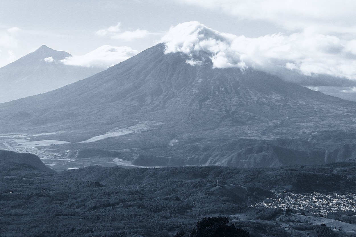 Gvatemalos tektoninė situacija. Kokos plokštės subdukcija Vidurio Amerikos giliavandeniame lovyje po Karibų ir Šiaurės Amerikos plokštėmis pažymėta dantyta linija; pilkais trikampiais parodyti ugnikalniai. Šaltinis čia.