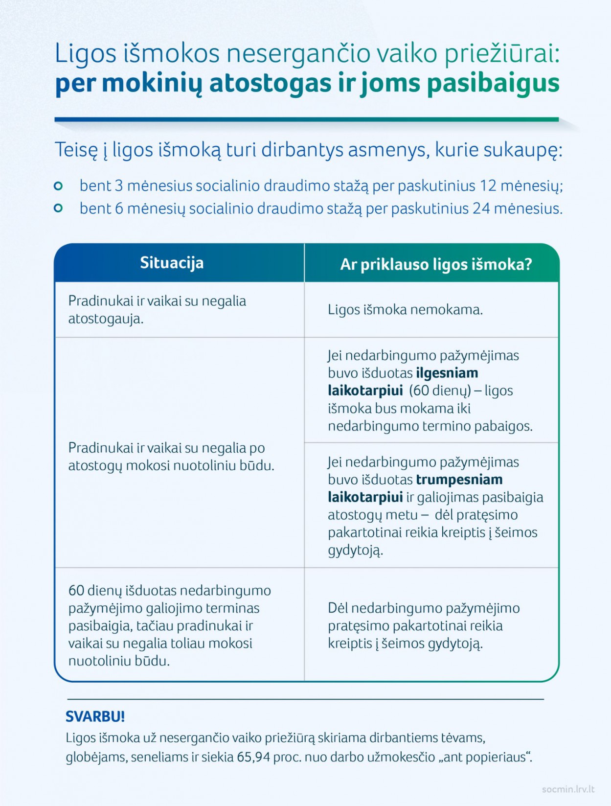 Kai karantino metu atsiranda būtinybė prižiūrėti darželinuką, priešmokyklinuką, pradinuką ar pagal bendrojo arba specialiojo ugdymo programą besimokantį vaiką su negalia dirbantiems tėvams, globėjams, seneliams gali būti mokamos ligos išmokos. Ligos išmoka už nesergančio vaiko priežiūrą siekia 65,94 proc. nuo darbo užmokesčio „ant popieriaus“.